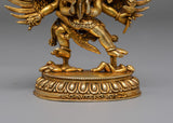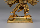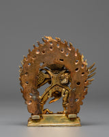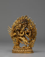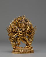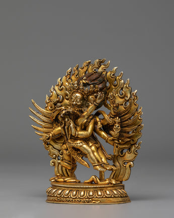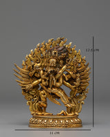 This magnificent handmade Dorje Phurba Buddhist statue, crafted from a gold-plated copper body, embodies the powerful wrathful deity Vajrakilaya, revered throughout Tibetan Buddhism for removing obstacles and protecting practitioners. Measuring 12.5 cm in height, 11 cm in width, and weighing 0.49 kg, this Vajrakilaya sculpture showcases extraordinary craftsmanship with intricate detailing. Dorje Phurba, meaning “Vajra Dagger,” is depicted in his classic three-headed form with six arms holding sacred implements, including the ritual phurba dagger, while embracing his consort in a powerful union that symbolizes the inseparable nature of wisdom and compassion. The statue features an elaborate flaming aureole representing the transformative fire of wisdom that consumes negativity. His fierce expression, adorned with a skull crown and flowing scarves, radiates wrathful compassion. The deity stands powerfully upon a lotus throne, trampling obstacles beneath his feet, symbolizing the subjugation of ego and delusion.