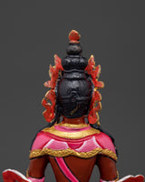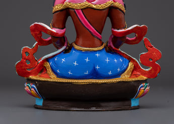 This handmade Tibetan Amitayus statue stands 21 cm tall, 16 cm wide, and weighs 1.34 kg. It is made of copper and hand-painted with amazing acrylic colors. Each detail, from the lotus-petal base to the carefully carved flowing robes, is meticulously portrayed, demonstrating exceptional artisanal expertise. The polished copper shines beneath layers of brilliantly colored acrylic, lending the sculpture a lively, bright aspect.
