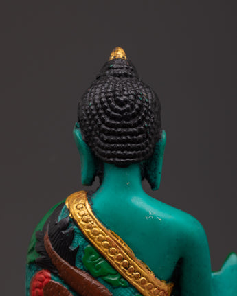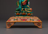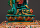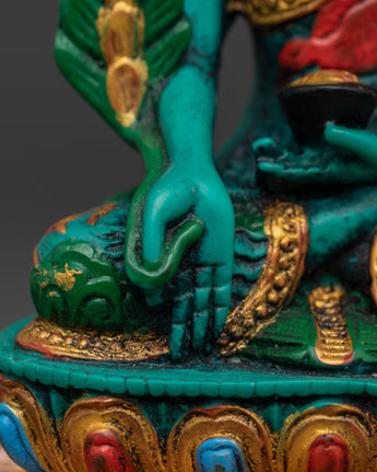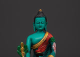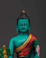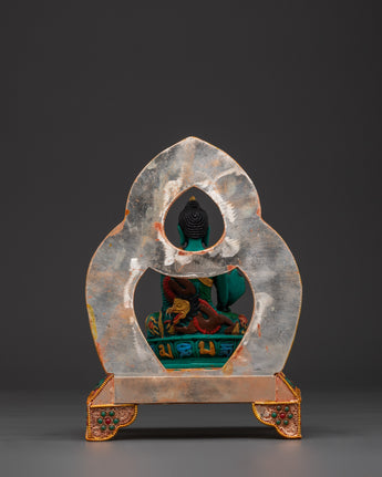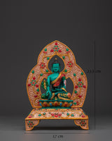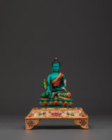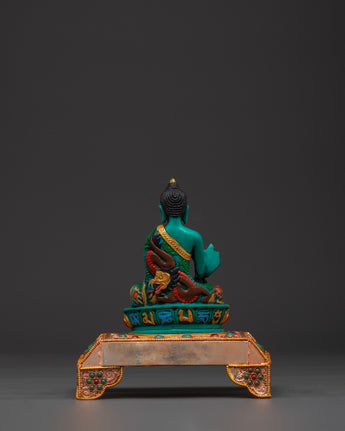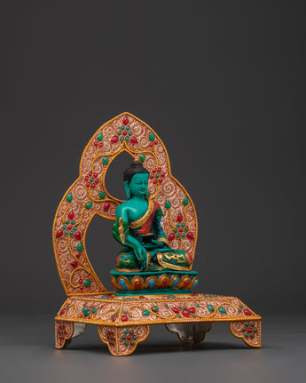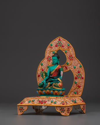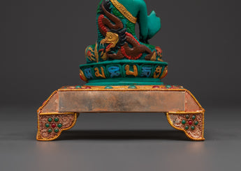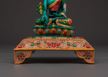 In Tibetan Buddhism, the Medicine Buddha represents healing and the abolition of bodily and spiritual illness. The intricate filigree work and vibrant jewels on the throne base heighten the spiritual importance of this holy art piece. Whether used for personal meditation or as a decorative centerpiece, this Medicine Buddha statue reminds us of the power of healing and inner calm. It is an essential addition to any Buddhist shrine or sacred location, making it ideal for practitioners and collectors.