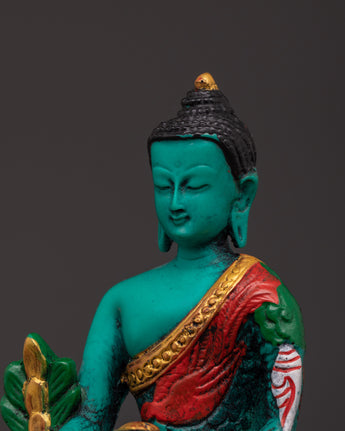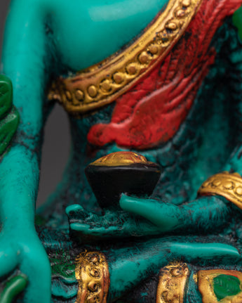 The Medicine Buddha is depicted holding an alms bowl in which a healing portion is believed to be found. In his right hand, he carries a myrobalan plant, a medical herb representing his capacity to heal physical and spiritual illnesses. The golden colors, excellent craftsmanship, and use of artificial turquoise and coral stones highlight the Medicine Buddha's spiritual presence.