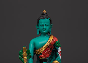 Medicine Buddha is referred to as the Buddha of Healing, also known as Bhaishajyaguru in Sanskrit. His teachings stress the desire to amass wealth and pleasure in this life while also working to relieve sentient beings from disease, pain, suffering, and misery. Many Mahayana meditators admire his healing prowess. He is typically shown with a begging bowl and medicinal herbs while having a blue (lapis lazuli) body.