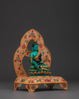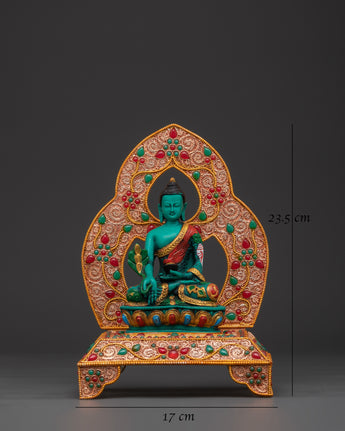 The Healing Buddha Copper Statue with Halo and Throne Base is a stunning portrayal of the Buddha of Medicine, also known as Bhaisajyaguru, with his healing power and compassion. Standing 23.5 cm tall and 17 cm wide, this handmade statue has been made of copper and gold-plated, with beautiful filigree work that enhances its holy aura. The statue, weighing 0.86 kg, is suitable for meditation areas, altars, or as a thoughtful spiritual gift, representing the Buddha's devotion to alleviating suffering and promoting wellbeing.