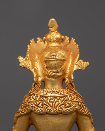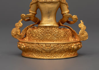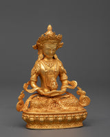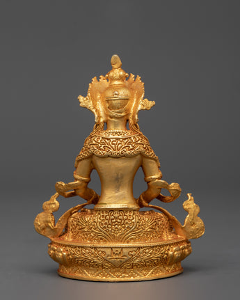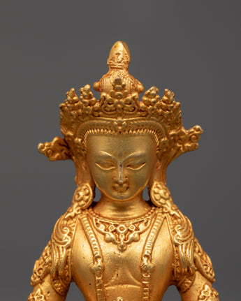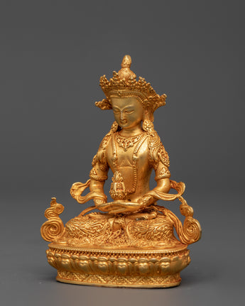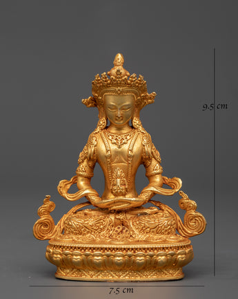 This Himalayan Amitayus Statue in Dhyana Mudra is a stunning representation of a Buddhist Deity, measuring 9.5 cm in height and 7.5 cm in width. This sculpture is crafted from a copper body with gold plating, capturing the serene essence and healing qualities of Amitayus, the Buddha of Longevity. This statue emanates his calming and protective aura.