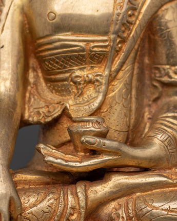 The sculpture, made of copper and beautifully gold-plated, stands 21 centimeters tall, 14.5 centimeters broad, and weighs 1.19 kilograms. Its exquisite facial features, beautifully patterned robes, and peaceful proportions are all typical of Himalayan and Tibetan art. The golden finish offers a bright elegance, as well as a sense of reverence, making it an excellent choice for sacred areas, shrines, and meditation corners.