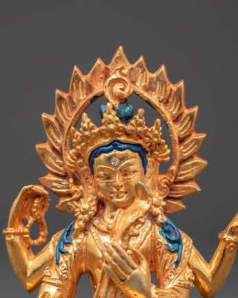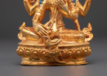 This gold-plated Saraswati copper statue captures fine details of the goddess’s serene expression, flowing ornaments, and symbolic attributes, including the veena, scriptures, and lotus. In Hindu tradition, placing a Saraswati statue on a study desk, home altar, or sacred space is believed to invite blessings of learning, creativity, clarity, and wisdom. The radiant finish enhances its sacred presence, making it a meaningful piece for both personal devotion and as a gift for spiritual seekers.