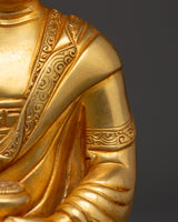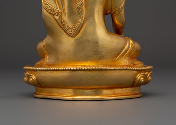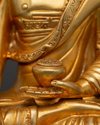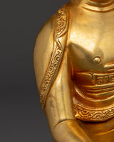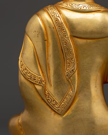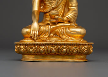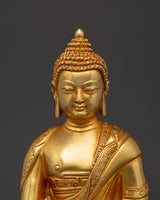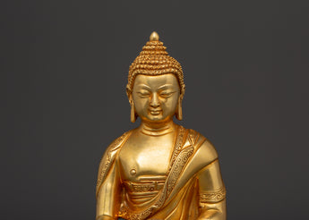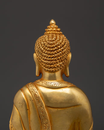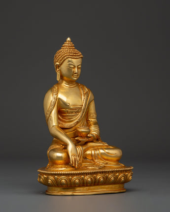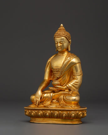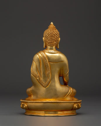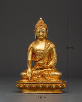 Shakyamuni Buddha is renowned for his teachings on compassion, enlightenment, and mindfulness. Shakyamuni Buddha is depicted sitting in the lotus pose (padmasana), indicating his steady concentration and mastery over the distractions of the material world. His right hand stretched toward the earth in the bhumisparsha mudra, representing his moment of enlightenment, as he invited the earth to witness his awakening. The left hand, lying gently in his lap in dhyana mudra holding an alms bowl, depicts the profound state of meditation and mindfulness that leads to insight and clarity. The fine gold plating adds depth and beauty to the precise details, such as his robes and facial features, showcasing traditional craftsmanship.