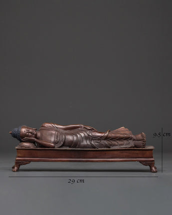 This historical Sleeping Buddha statue is handmade from oxidized copper and stands 9.5cm tall and 29cm wide, weighing 1.32kg. The sculpture depicts Buddha resting comfortably on a base, signifying his ultimate enlightenment and escape from the cycle of birth and death. The oxidized copper finish adds depth and sacred beauty to this treasured object.