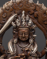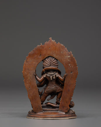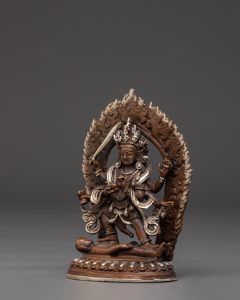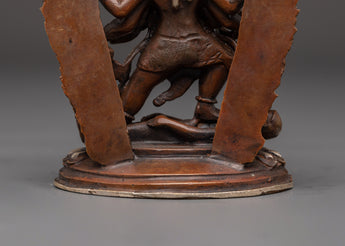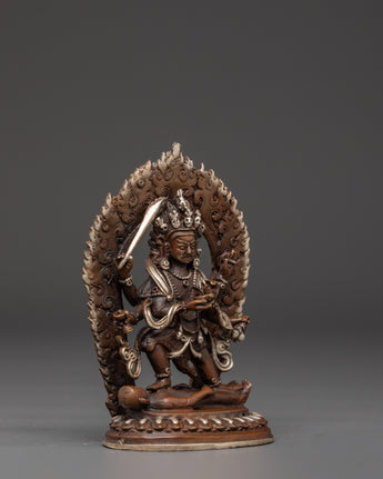 Kal Bhairav is represented with a ferocious yet controlled expression and a posture that exudes strength and stability. The oxidized copper finish lends it a sacred appearance, while the silver plating adds a touch of elegance and a magnificent brightness. The figure is exquisitely carved, with delicate decorations on its crown, ornaments, and the flames of transformation behind it, making it a valuable addition to any spiritual collection.