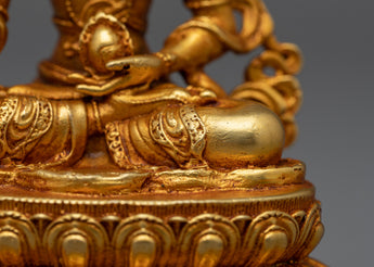 The 11-cm-tall Kshitigarbha Bodhisattva Statue is evidence of the altruistic promise to ease suffering and lead beings towards enlightenment. This precisely crafted statue is machine-made on a copper body, guaranteeing its longevity and accurate portrayal of the Bodhisattva's shape. Adorned with an electro-gold plating, it emanates a sense of spiritual splendor and wisdom, embodying the noble qualities of Kshitigarbha.