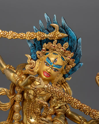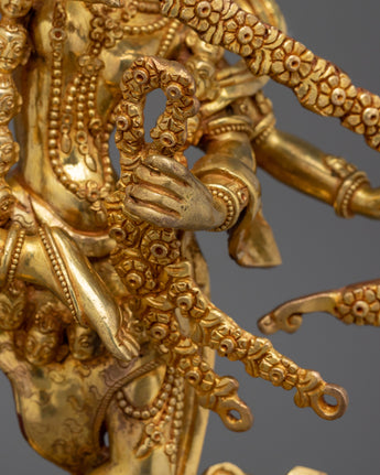 This Kurukulla Buddhist Goddess Statue is 34 cm tall, 21 cm wide, and weighs 3.58 kg, making it an amazing centerpiece for spiritual areas. The statue is made of copper with gold plating and emits celestial beauty and purity. Kurukulla's dynamic, wrathful stance represents her transforming capacity to remove obstacles and attract beings to enlightenment. Her burning mandorla symbolizes the wisdom fire that purifies negativity, while the richly decorated lotus pedestal represents purity rising from chaos.
