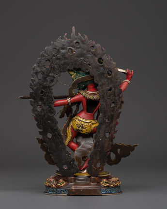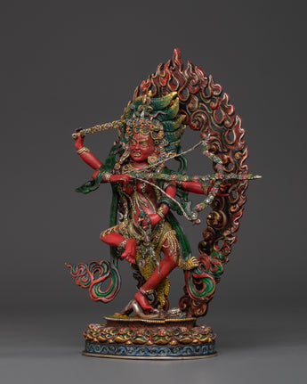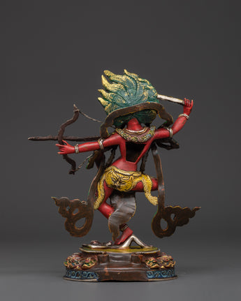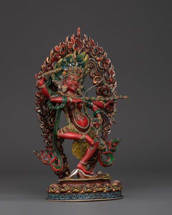 This gorgeous portrayal has a copper body hand-painted with vibrant acrylic colors to express her fiery energy and commanding presence. Kurukulla is depicted in a dynamic dance posture, holding her characteristic flower bow and arrow, representing her ability to draw in all favorable conditions with grace and spiritual force. Surrounded by a fiery aureole, her look radiates fierce protection and caring intent, representing the duality of her wrathful and loving energies.