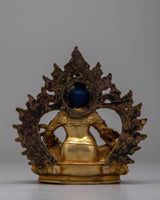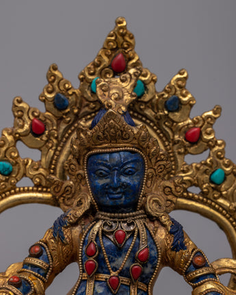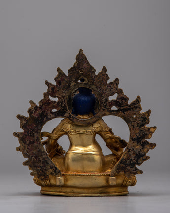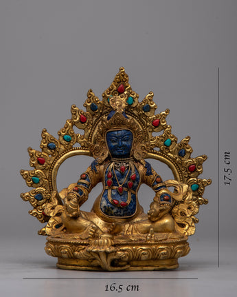 The exquisitely made Lapis Lazuli Dzambhala Statue combines artistic skill with spiritual symbolism and is based in Tibetan Buddhist tradition. This statue, which is 17.5 cm tall and carefully sculpted by hand, has a body made of lapis lazuli, a precious stone valued for its deep blue hue representing truth and knowledge. Electrogold plating gives the copper base a glossy sheen, amplifying its visual appeal.
