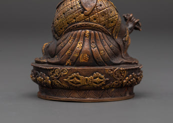 This Lotus Born Master Rinpoche Statue, made from oxidized copper to showcase the profound spiritual essence and traditional artistry of Tibetan Buddhist sculpture, honors the heritage of the great Vajrayana teacher. This small yet potent statue, which stands 10.5 cm tall by 7 cm wide and weighs 0.45 kilogram, is a representation of the famed enlightened figure who introduced Buddhism to Tibet, Guru Padmasambhava. Protection, introspection, and the dispersing of negative energy are all encouraged by his calm yet powerful presence.