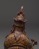 From his lotus hat and staff to the expressive features that exude serene authority, this oxidized copper statue of Guru Rinpoche is rich in detail. The piece's oxidized finish lends it an aged, revered look, signifying enduring strength and wisdom. This statue, which harnesses the blessings of Padmasambhava, who is renowned for conquering challenges and leading followers on the way to enlightenment, is perfect for individual altars, meditation areas, or as the focal point of a Buddhist shrine. A thoughtful present for both collectors and spiritual seekers. This Lotus Born Master Rinpoche statue (Tibetan Padmasambhava) is a symbol of spiritual strength and ancestry, not merely a decorative piece. This statue is ideal for Tibetan Buddhists as it encourages rituals, offerings, and introspection.