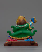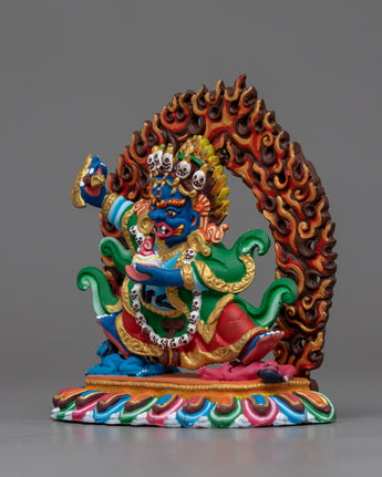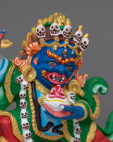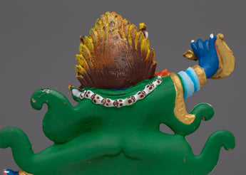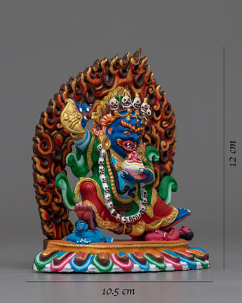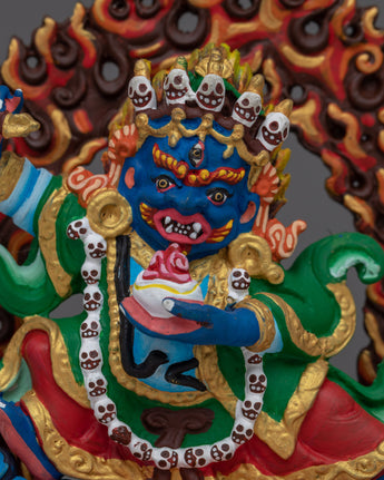This statue, created through a precise machine-molding process, mixes the timeless elegance of copper with the richness of gold and acrylic paintings, bringing to life Mahakala's powerful presence. From his ferocious countenance to the complex jewelry he wears, every element in this sculpture is meant to evoke the deity's tremendous soul.