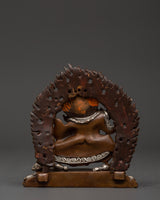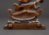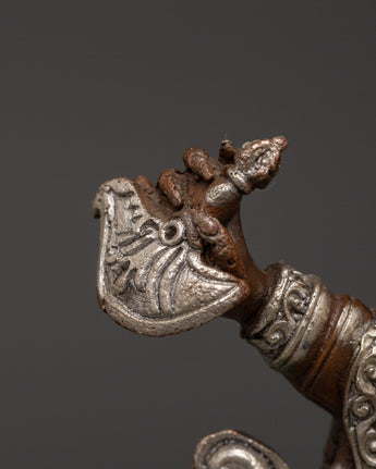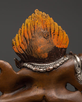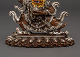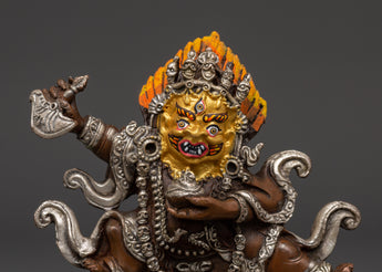 This carefully carved Mahakala Bernagchen Statue is 12 cm tall and weighs 0.56 kg, making it the perfect size for your altar or meditation area. The statue is made of oxidized copper and plated with silver, with exquisite features that represent Mahakala's furious energy and transformational ability. Mahakala Bernagchen emerges in his powerful form, his passionate look and stance embodying the fierce compassion that protects and transforms. In his left hand, he holds a skull cup, which represents the transformation of negativity and ego illusions into wisdom, while his right hand holds a kartika, a ceremonial knife that cuts away ignorance and attachment.