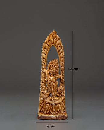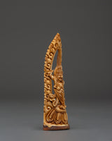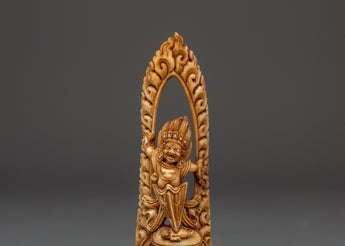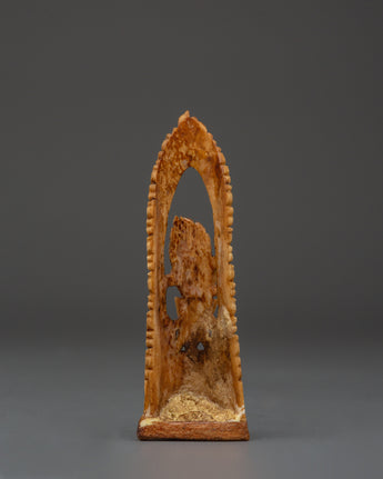 This exquisite Mahakala Protector Deity statue, handcrafted from sustainably sourced yak bone, invokes great protection and spiritual strength. Standing 14cm tall and 4cm wide, this Tibetan guardian figurine depicts Mahakala, a ferocious protector god respected in Himalayan Buddhist traditions. This sculpture, which sits on a natural wood foundation, mixes spiritual symbolism with true craftsmanship, making it an important addition to meditation spaces, personal altars, or ritual collections.