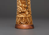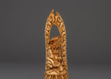 This hand-carved Mahakala with Consort statue is 13.5cm tall and 5cm broad. It is made of ethically sourced yak bone and has a wooden base. Weighing 0.040kg, the statue depicts the powerful protector deity Mahakala and his consort in a dynamic embrace, signifying the union of wrathful force and compassionate knowledge required for spiritual transformation.