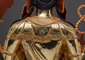 This Majestic Buddhist God Chenrezig Statue, painstakingly made from copper and finished with a bright gold-plated body, is a piece of art that will bring divine blessings and beauty home. This small yet eye-catching Ganesh idol, which is 51 cm in height and 39 cm in breadth, is intended to radiate happiness and spiritual presence in any area. Its 0.87 kg weight makes it the ideal size for altar areas, meditation nooks, and home temples. It embodies the spirit of traditional Indian workmanship and spiritual beauty.