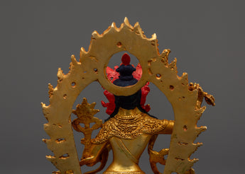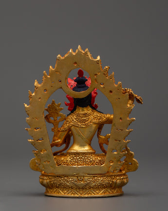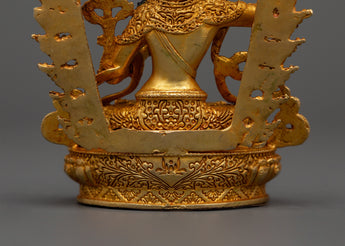 This Manjushri statue measures 10.5 cm tall, 8 cm broad, and weighs 0.21 kg. The statue, made of copper and plated with gold, exudes elegance and spiritual depth. Manjushri, a highly revered figure in Mahayana and Vajrayana Buddhism, serves as a spiritual guide for students, meditators, and seekers of truth. His young look embodies the clarity and freshness of awakened insight. This gold-plated Manjushri statue, a potent symbol of enlightened intelligence and loving guidance, is ideal for enhancing spiritual study rooms, presenting to Buddhist practitioners, or adding to sacred decor collections.