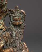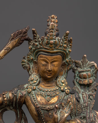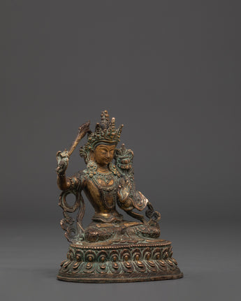 This Handcrafted Manjushri sculpture is an embodiment of Manjushri, the revered Bodhisattva of Wisdom. Standing at 15cm tall and made from copper with an antique finish, this statue is not only a striking addition to your home or meditation space but also a powerful tool for spiritual growth. Manjushri is associated with wisdom, insight, and the purification of ignorance, making this statue an ideal companion for those seeking enlightenment and a deeper understanding in their Buddhist practices.