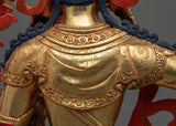 This stunning Tibetan Manjushri Statue is made from a copper body with 24K gold gilding, and depicts a deity with a calm expression seated atop a moon disc lotus seat. The deity is shown holding a wisdom sword in his right hand, symbolizing the power to cut through ignorance and delusion, and a lotus in his left represents purity and enlightenment.