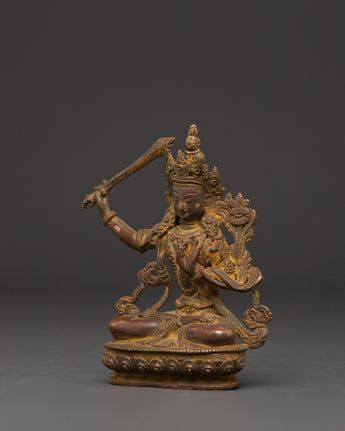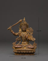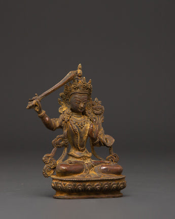 Elevate your spiritual space with this gorgeous Manjushri, the Bodhisattva of Wisdom statue, skillfully handmade from copper. This 14cm tall and 10cm wide statue depicts Manjushri's tranquil and enlightened presence, regarded in Tibetan Buddhism as the embodiment of wisdom and understanding. This copper statue, perfect for meditation nooks, altar decorations, or a thoughtful gift, symbolizes clarity, insight, and intellectual advancement to any setting.