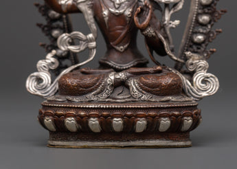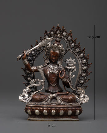 This Tibetan bodhisattva of wisdom, the Manjushri statue, measuring 10.5 cm in height and 8 cm in width, weighs 0.19 kilograms. The sculpture is skillfully cast in oxidized copper with delicate silver plating, highlighting every fold of his robes and jewel-encrusted crown. The mixed metals rest atop a detailed lotus pedestal, creating an appealing combination that enhances both its visual appeal and stability. Its tiny size makes it ideal for home altars, meditation areas, or office desks.
