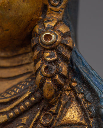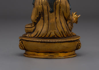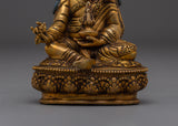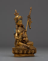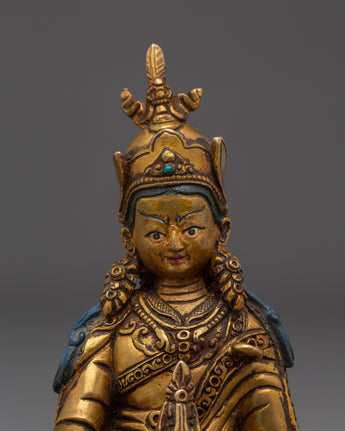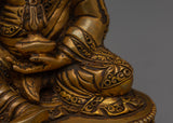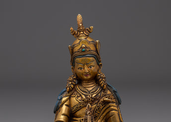 The Meditation Idol Guru Rinpoche Statue depicts Padmasambhava, the renowned Buddhist master known as the "Lotus-Born." Guru Rinpoche is revered as the founder of Vajrayana teachings in Tibet, as well as a guide who removes barriers and provides enlightenment and spiritual clarity to practitioners. This exquisitely carved figurine made of copper with gold-plated details depicts him seated in meditation, exuding calm and a strong spiritual presence.