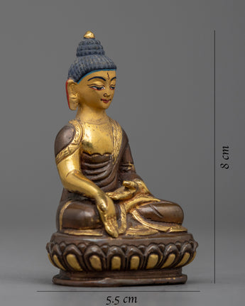 Let your senses be captivated by the Namo Ratna Sambhava Statue as it elevates your spiritual journey. Measuring 8 cm in height, this remarkable work of art is a representation of spiritual grace. It is painstakingly crafted from a copper body, lavishly gilded in 24k gold, and enhanced with an enthralling acrylic painting.