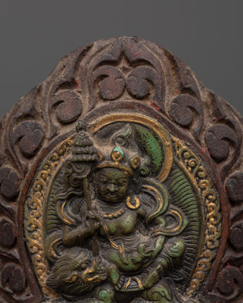 Handcrafted with a wooden body and stone powder accents, this statue depicts Namtoshe, the Tibetan deity of riches and prosperity. This Namtoshe Wooden Statue is 8cm high and 6.5cm wide, and weighs 0.062kg.  The beautiful craftsmanship and vivid colors make it a standout addition to any room, perfect for bringing plenty and good fortune.