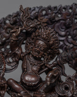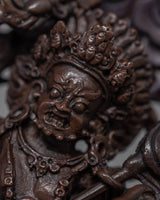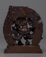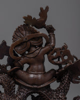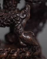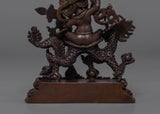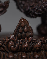 This small Namtoshe statue is crafted by machine on an oxidized copper body. He is a lord of wealth in Buddhism. Namtoshe is depicted seated on a roaring lion on a lotus. In his right hand, he wields a triumph banner, and in his left, a mongoose wish-granting jewel, establishing him as the wealth deity.