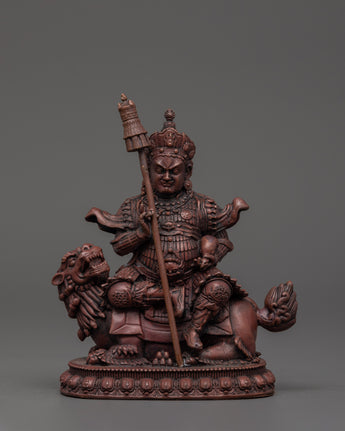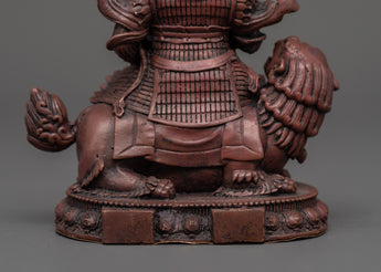 Namtoshe is sitting atop a roaring snow lion, holding a sword and a mongoose, representing both authority and the abolition of poverty. This piece is meticulously created, from the detailed armor to the decorative flame-like halo surrounding him. The copper finish gives it a rich, historic appearance, making it ideal for collectors and practitioners looking for a spiritual guardian and bringer of wealth.