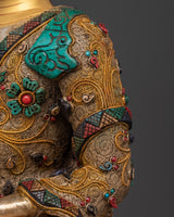This finely carved Peaceful Medicine Buddha Sculpture will provide serenity, healing, and balance to your house. Standing at 46.5 cm tall, this magnificent piece boasts delicate filigree work and bright gold plating, making it a remarkable addition to any religious space. The statue is artistically embellished with valuable stones, including coral and turquoise, which are thought to provide protection, healing, and tranquillity. This Medicine Buddha sculpture represents health, wisdom, and the ability to heal both physically and spiritually.