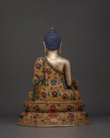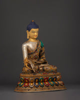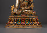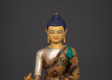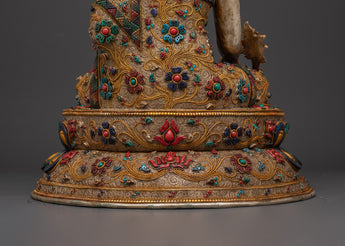 The statue is made of copper and plated with gold and silver. It flows with elegance and meticulous craftsmanship. The judicious use of artificial stones, such as coral and turquoise, enhances their spiritual meaning while also increasing their overall beauty and value. This serene image of the Medicine Buddha, often associated with compassion and healing, can be used in meditation to enhance inner serenity and well-being. This piece, whether displayed on an altar, in your living room, or your meditation area, will promote peace and spiritual well-being.