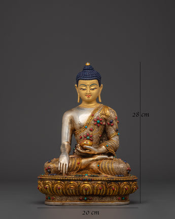 This Peaceful Shakyamuni Buddha sacred figurine is a work of traditional Tibetan art, painstakingly created to capture both spiritual essence and fine detail. This statue stands 28cm tall and weighs 3.29kg. It is made of copper and has intricate gold and silver plating, as well as gorgeous filigree work. The statue is beautifully embellished with imitation turquoise and coral stones, which enhance its visual richness and spiritual presence. This wonderfully sculpted sculpture is ideal for meditation settings, altars, or as a stunning centerpiece representing peace and enlightenment.
