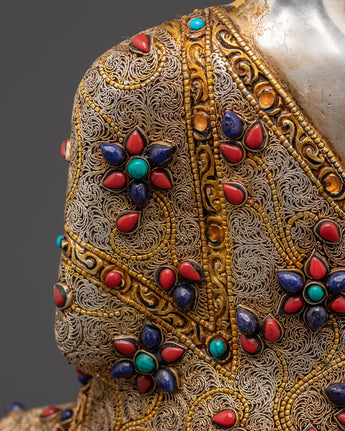 The use of artificial turquoise and coral stones enhances the statue's spiritual beauty and importance. These stones are meticulously placed in the statue to complement the filigree patterns, resulting in a visually attractive and significant artwork. Due to the combination of materials, precise craftsmanship, and spiritual connotations, this statue is more than just a beautiful piece of art; it is also a profound spiritual item. It is excellent for serious collectors, practitioners, or anybody looking to enhance their sacred space with a potent emblem of enlightenment and harmony.