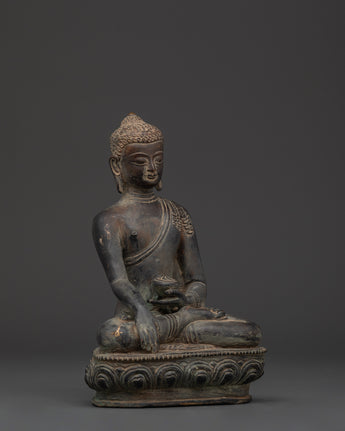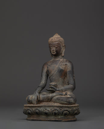 Shakyamuni Buddha, the historical founder of Buddhism, personifies knowledge, compassion, and the road to enlightenment. His calm, tranquil demeanor and position, with one hand holding a bowl, represent the teachings and wisdom of the Dharma. The oxidized copper body offers a timeless look that elevates the spiritual ambiance of any environment.