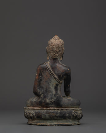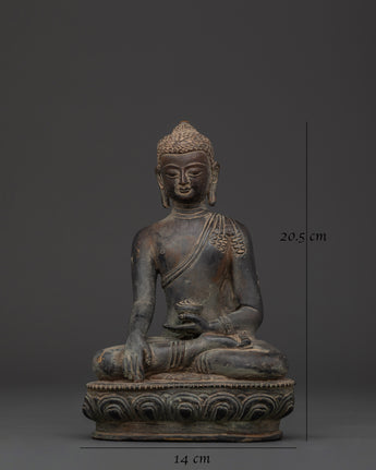 This Peaceful Shakyamuni Buddha Statue is 20.5 cm tall and 14 cm wide, with a weight of 1.54 kg. The statue, crafted from oxidized copper, conveys a sacred beauty with its deep, rich spiritual aura. The seated Buddha is meticulously crafted, portraying a tranquil, meditative pose. This item is ideal for meditation rooms, home altars, and spiritual collections.