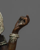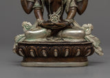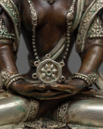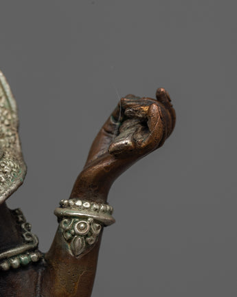 At a majestic height of 17.5 cm, the Prajna Paramita Goddess Statue represents the understanding of emptiness and divine insight. This machine-made, precisely crafted statue has a timeless appeal due to its rusted copper body. Wearing an electro-silver coating, it glows calmly and dreamily, signifying the light of Prajna Paramita's teachings.