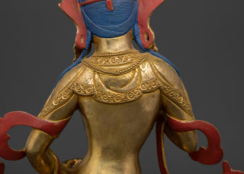 This magnificent 34cm Purification Deity Vajrasattva Statue in Tibetan Buddhism will enhance your sacred area. This 3.62 kilogram statue, which is made of gold-plated copper and embellished with imitation coral and turquoise stones, is a powerful representation of spiritual change and purification. This statue is a must-have for meditation areas and altar arrangements, as Vajrasattva is revered for his role in clearing obscurations and negative karma.