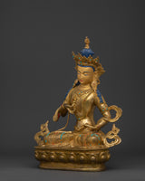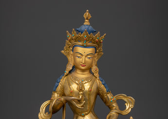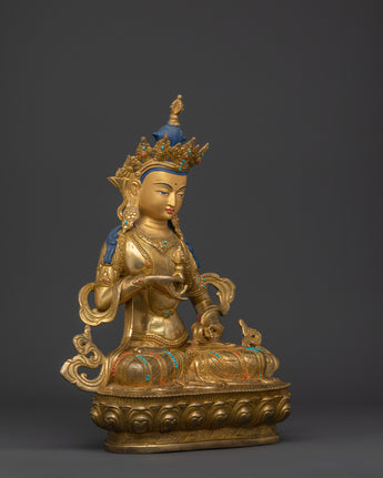 Exquisite workmanship highlights Vajrasattva's calm demeanor and ceremonial tools in this statue of him sitting on a lotus throne. His presence encourages enlightenment, inner tranquility, and spiritual clarity. The statue's spiritual aura is enhanced by the thoughtfully positioned coral and turquoise stones, which showcase Tibetan commitment and skill. This statue is ideal for collectors of genuine Buddhist art or practitioners looking to enhance their purifying rituals.