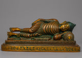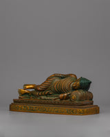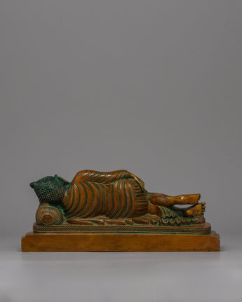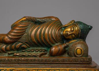 The Buddha's final entry into nirvana, also known as parinirvana or sleep, is symbolized by the resting Buddha, also known as the sleeping or parinirvana Buddha. This marks the end of the Buddha's earthly existence. The Buddha is depicted in this statue in a reclining position, exuding a serene and serene aura.