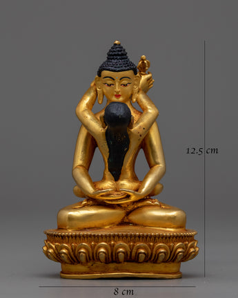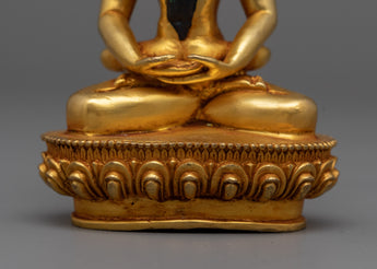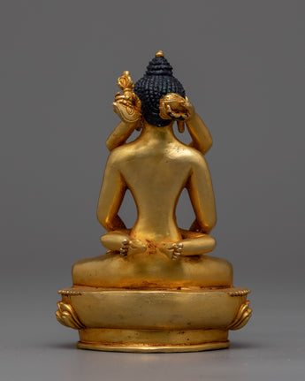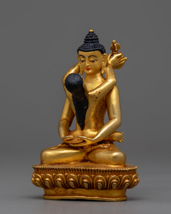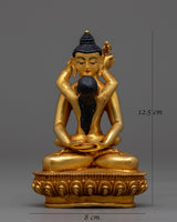 The 12.5cm-tall Samantabhadra and Consort Statue depicts the peaceful combination of compassion and wisdom embodying Samantabhadra and his consort. This statue is machine-made on a copper body, a testament to its exquisite craftsmanship and perfection in design. Its electro-gold plating is adorned with majesty and brilliance, symbolizing the celestial attributes of Samantabhadra and his consort.