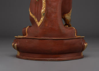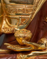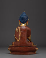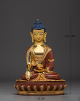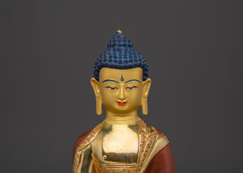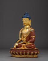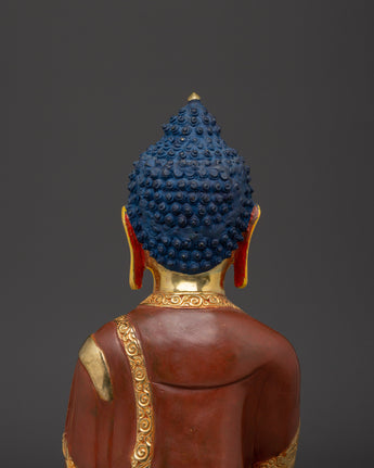 Shakyamuni Buddha is depicted in the classic meditation stance, with his right hand touching the ground in the "Bhumisparsha Mudra," indicating his enlightenment under the Bodhi tree, and his left hand holding a cup of nectar, symbolizing spiritual nourishment and purity. His tranquil expression and the beautiful artwork on his robes reveal inner serenity and knowledge. The carefully made curls in his hair and the urna symbol on his forehead represent his enlightened status.
