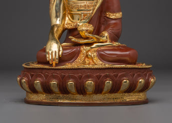 This handcarved Shakyamuni Buddha, the Founder of Buddhism Statue is 32.5 cm tall, 23 cm wide, and weighs 2.46 kg. It is made of copper and gold-plated, with a detailed lotus base that adds to its spiritual and religious presence. The combination of a copper body and gold finish creates a bright, timeless appearance that is perfect for home altars, meditation rooms, or sacred collections.