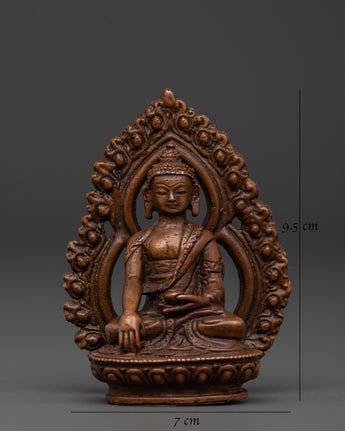 Shakyamuni Buddha, seated on a lotus moon disc, exudes peace and enlightenment. This little yet spiritually powerful piece, measuring 9.5cm in height by 7cm in breadth and weighing 0.20kg, is skillfully created from oxidized copper. The Buddha is represented in the typical meditation pose, which represents inner serenity, awakening, and realization of the truth. The ornate lotus throne and moon disc base symbolize purity, rebirth, and the transcending of earthly suffering, making this an excellent spiritual focal point for any sacred place.