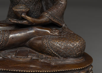The details on this Shakyamuni Buddha statue exemplify traditional Tibetan craftsmanship, with each feature painstakingly carved to highlight the Buddha's serene look and magnificent position. The rich, oxidized copper finish has an ancient appeal, adding to its aesthetic value and symbolic significance. Whether displayed on an altar, in a meditation room, or as a centerpiece in your home decor, this statue is a continual reminder of spiritual awakening and mindfulness. The elaborately crafted lotus pedestal emphasizes its religious presence, making it a wonderful gift for anybody on a spiritual journey.
