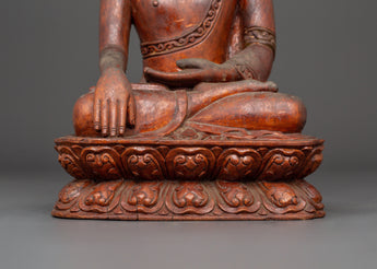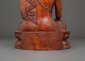 This Shakyamuni Historical Buddha statue is 33 cm tall, 20 cm broad, and weighs 1.61 kg. Crafted from hand-carved wood, it sits on a lotus pedestal with rich workmanship that complements the Buddha's tranquil appearance. The warm tones of the wooden body create a natural and peaceful presence, making it an ideal focal point for meditation rooms, home altars, or spiritual collections.