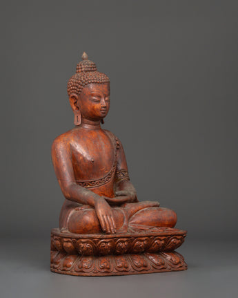 Shakyamuni Buddha is depicted sitting in the lotus pose (padmasana), indicating his steady concentration and mastery over the distractions of the material world. His right hand stretched toward the earth in the bhumisparsha mudra, representing his moment of enlightenment, as he invited the earth to witness his awakening. The left hand, lying gently in his lap in dhyana mudra, depicts the profound state of meditation and mindfulness that leads to insight and clarity.